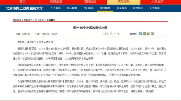 2020年底前,將有計劃、有步驟地完成副中心361個小區(qū)的供水管網(wǎng)改造工作,其中,140個小區(qū)將置換掉自備井,221個老舊小區(qū)將改造供水管網(wǎng),共計將改造支戶線206公里,同步還將為各個小區(qū)加裝改造流量計、水表等配套設施,大大提升城市供水安全保障。